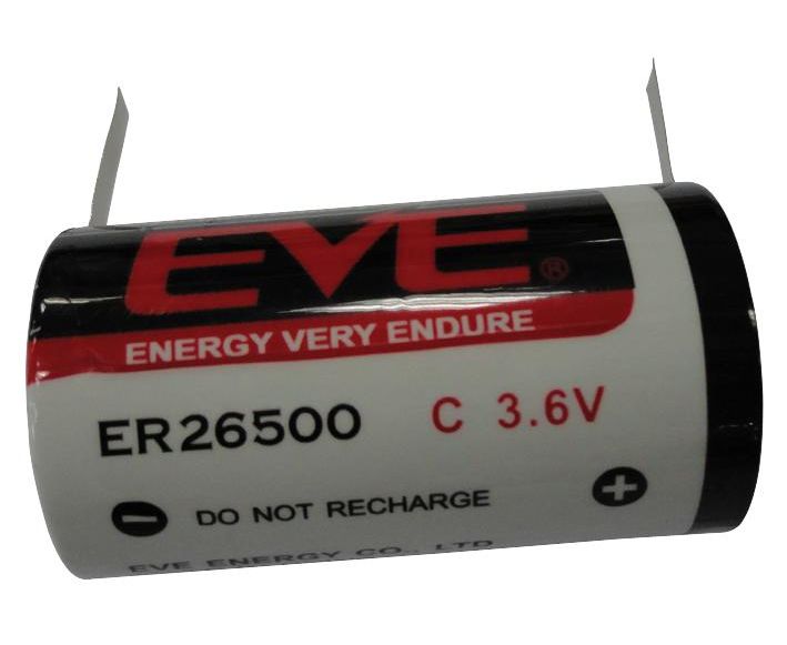 The ER26500T is a C 3.6V/8.5Ah cylindrical-cell bobbin type Non-rechargeable Battery features a lithium thionyl chloride technology and solder tab terminals. High and stable operating voltage. High minimum voltage during pulsing. Low self discharge rate (less than 1% after 1 year of storage at 25°C). Nominal capacity at 4mA, 25°C, 2V cut-off. The capacity restored by the cell varies according to current drain, temperature and cut-off voltage. Bobbin style lithium thionyl chloride cells are maximised for long life. They offer very high energy density, low self discharge and a long storage life and are particularly suited to low current applications.