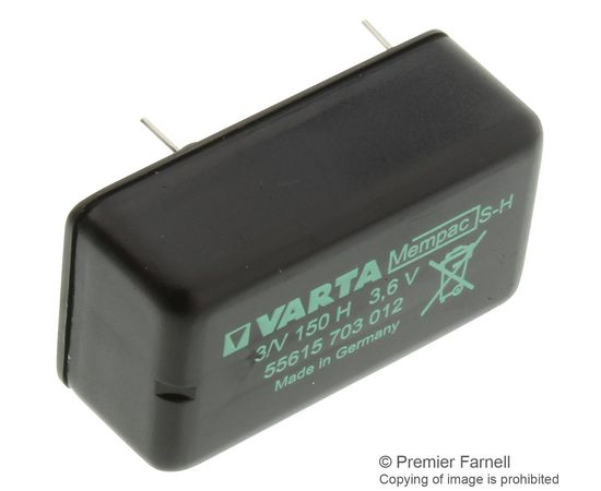 The 55615703012 from Varta is a rechargeable nickel metal hydride button cell with PCB terminal pins. This button cell features excellent overcharge capability due to patented GCE electrode, low self discharge of 20% at RT after 1 year, flat and stable discharge voltage, long life of typical 500 full cycles and slim design. Battery cells are used for RTC backup and memory backup.