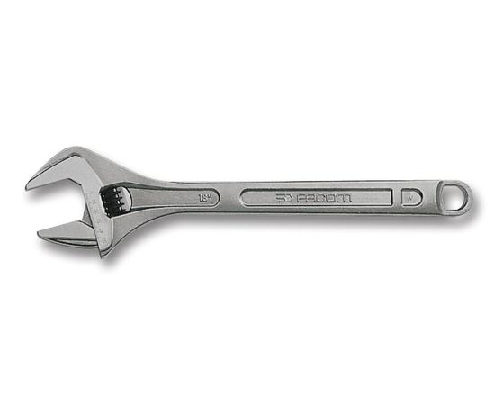 The 113A.6C is a 155mm Adjustable Wrench with chromed body and polished jaw faces, contoured handle for improved handling, improved worm screw access, tapered jaw tips for optimum access, non-protruding moving jaw at maximum capacity, millimetre graduations for pre-setting jaw opening, clockwise rotating worm screw, registered design.