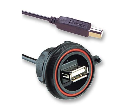 The PX0844/A/0M50/B is a 500mm black USB Extension Cable with a sealed type-A front of panel socket at one end and standard type-B plug on other end. It features water and dustproof to IP68 when mated with compatible connector.