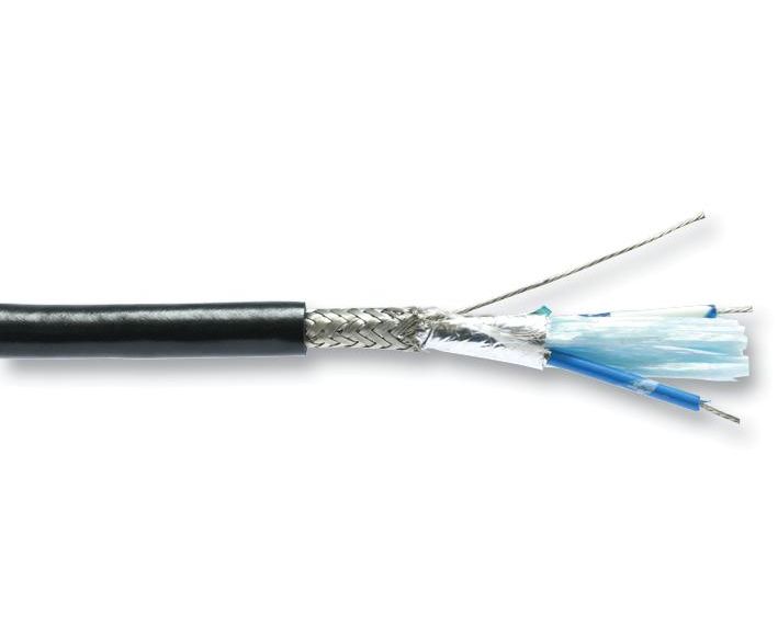 The 3105A 010500 is a 1-pair 500ft 22AWG Shielded Cable with stranded tinned copper conductors and Datalene® foam polyethylene insulation. This EIA industrial RS-485 PLTC/CM twisted pair multi-conductor cable comes with a drain wire, UV-resistant black PVC jacket, Beldfoil® aluminium foil-polyester tape shield (100% coverage) and a tinned copper braid shield (65% coverage). This multi-conductor cable delivers low voltage analogue data and signal transmission within enclosures from controllers and I/O's to devices such as temperature and pressure sensors, relays, valves, meters, thermocouples, solenoids, actuators, contactors, push buttons and alarms.
