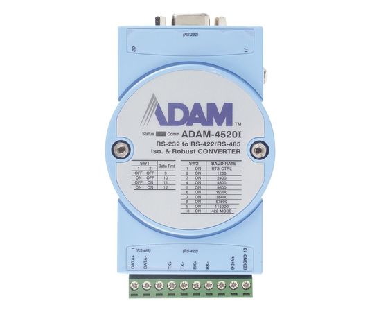 The ADAM-4520I-AE is a robust RS-232 to RS-422/485 Converter, automatic RS-485 data flow control, Surge protection RS-485 data line, transmission speed up to 115.2kbps, networking up to 1200m, reserved space for termination resistors, power and data flow indicator for troubleshooting. This converter is easily mounts on a DIN-rail, panel or piggyback.