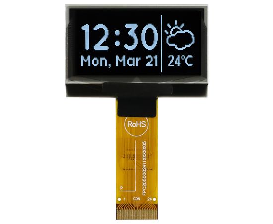 The MCOT128064B1V-WM from Midas is a white on black appearance 128 x 64 resolution OLED module.