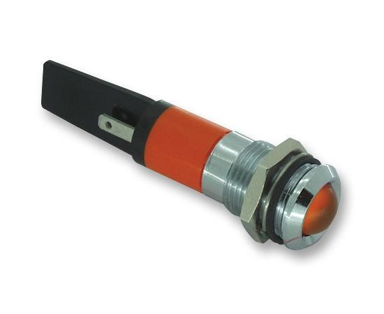 The 19310230 is a Neon Indicator with an isolating spacer and satin chrome bezel. IP67 in accordance to DIN EN 60529, gap between lens and bezel and gap between bezel and front-plate sealed to IP67 when using the supplied gasket. The plastic (polycarbonate) is limited resistant against chemicals. The indicator with tab connection are not qualified for soldering.