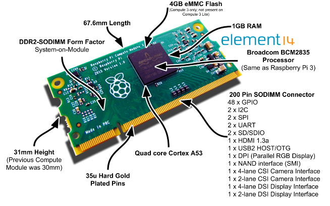 Новый вычислительный модуль Raspberry Pi Compute Module 3 построен на архитектуре Raspberry Pi (процессор BCM2837 и 1Гб оперативной памяти), так же на плате установлена 4Gb энергонезависимая EMMC Flash память (которая является эквивалентом SD карты в Raspberry Pi 3 Model B). Вся эта начинка объединена на небольшой (67.6x30 мм) плате, которая вставляется в стандартный разъем DDR2 SODIMM (тот же тип разъема, который используется в некоторых портативных компьютерах для установки оперативной памяти). Энергонезависимая флэш-память подключена непосредственно к процессору на плате, а другие интерфейсы процессора доступны через контакты разъема на плате Ввода\Вывода. Вы получаете все преимущества однокристальной системы BCM2837, что означает что многие GPIO и интерфейсы доступны для разработки в отличии от потребительских версий компьютеров Raspberry Pi. Проектирование пользовательской системы относительно простой процесс, т.к. все технически сложные решения уже заложены в сам вычислительный модуль.