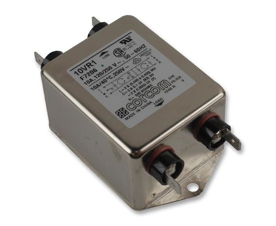 The 10VR1 is a 10A/250VAC two-stage general purpose RFI Power Line Filter with dual T-section RFI filter provides premium performance, well suited for low impedance loads where noisy RFI environments are present. Controls pulsed, continuous and/or intermittent interference and ER models offer low leakage current without deterioration of insertion loss.