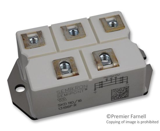 The SKD 110/16 is a SEMIPONT® 4 3-phase Power Bridge Rectifier with screw terminals, robust plastic case and a large isolated base plate. It is suitable for variable frequency drives, DC motor field supplies and battery charger.