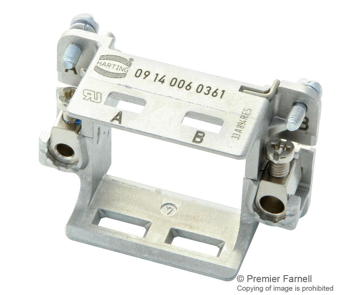 The 09140060361 from Harting is a Han hinged frame plus for 2 modules A-B. It is approved by IEC 61984, EN 60664-1, UL standards.