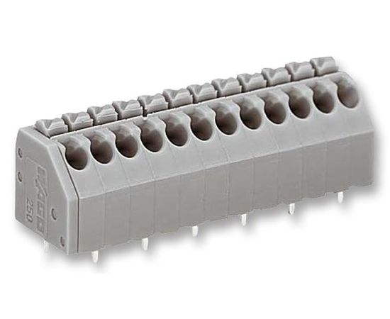 The 250-203. is a 3-pole grey PCB Terminal Strip with push buttons and front-entry wiring. This terminal strip has tin-plated contacts and a polyamide 6.6 insulator. It accepts 24 to 16AWG wire size.