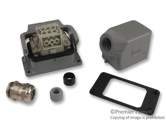 10330060000 является комплектом 6-контактного разъема Han-Kit® из, отлитого под давлением, сплава алюминия. Han® 6E, 6-контактный + PE вставки и винтовые клеммы 18 - 14AWG.