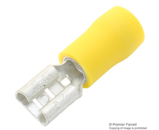 The FDD5-250 is a yellow female push-on double Crimp Terminal with vinyl insulation and brass/copper terminals as per BS6017 (1981) standard. Quick disconnect type, electro tin plated as per BS1872 (1984) standard. Easy cable entry guide which eliminate flared wire strands and bright electro tinned finish which prevents oxidization. A digit is indented above the crimp to verify correct usage. This FDD series terminal accepts 12 to 10AWG wire gauge.