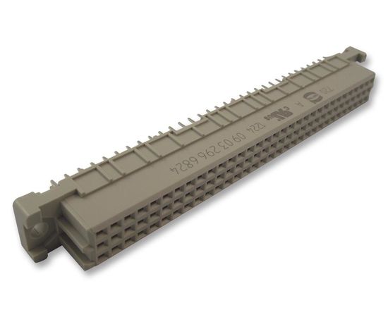 09 03 296 6824 является 96-позиционным, 3-х рядным, прямым сигнальным разъемом Type C DIN 41612 с фланцем и шагом 2.54мм и выводами под пайку. Контакты из сплава меди с покрытием из никеля и золота. Разъем DIN 41612 является стандартным для подключений типов плата-плата и провод-плата для передачи питания и данных. HARTING предлагает широкий диапазон стандартных разъемов с соответствием DIN 41612 и IEC 60 603-2. В зависимости от применения, разъемы от 3 до 160 контактов предлагаются с различными способами оконцовки, причем каждый контакт способен работать с токами от 2А до 40А. HARTING различает разъемы DIN Signal от DIN Power в зависимости от максимально допустимого рабочего тока на один контакт. До 2A для DIN Signal и более 2A для DIN Power. Диапазон HARTING har-bus® 64 обладает 160 контактами и является расширением 3-рядного, 96-контактного диапазона DIN 41612 type C с двумя дополнительными рядами.