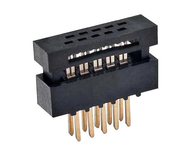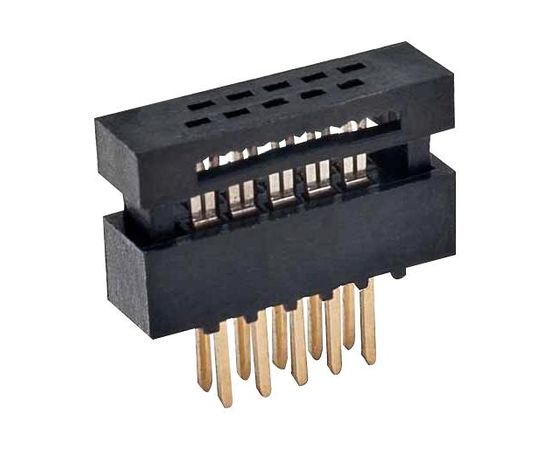 The M50-3800542 is a 10-contact 2-row 1.27mm male Wire-to-board IDC Connector with gold plated phosphor bronze contacts, 100% tin over nickel plated termination and black UL94V-0 PBT housing. The M50 series plug has angled connector orientation and cable connector connection type. It is suitable for use with 0.4mm square mating pin size, 0.635mm pitch ribbon cable, 30AWG ribbon cable.