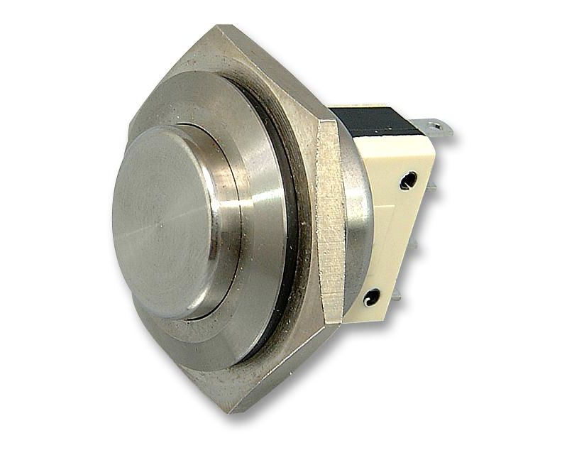 The MP0038/2 is a front panel mount vandal-resistant momentary Pushbutton Switch with fine silver contacts. It is made of stainless steel body/prominent button and glass filled nylon moulding.