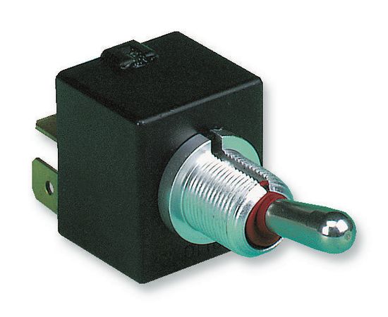 The T7 series high performance Sealed Toggle Switch is designed for use under severe conditions found in heavy equipment, industrial control, marine and appliance applications. Its front panel seal is accomplished with an O-ring under the bat handle. However, now a secondary visible bushing seal is offered as an option. T7 toggles are offered in single and double pole configurations. A choice of models is offered to handle power levels to 16A, 0.5HP and low level electronic switching applications. These toggles feature positive detent action for safe switching operation. In conjunction with the unique OTTO snap-action switch mechanism, the T7 offers non-teasible contact transfer. High contact pressure and superior contact wiping action of the OTTO design makes the T7 an excellent choice for switching loads from logic level up to 16 amps. Mounting hardware provided includes two hex nuts, one lock-washer and one keyway washer.