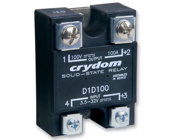 The D1D100 is a Solid-state Relay with panel mount, 1-DC series. DC output, MOSFET output. Redesigned housing with anti-rotation barriers. Easily paralleled for higher current applications.