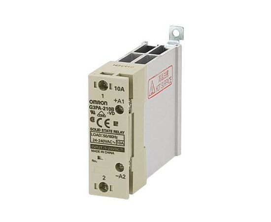 The G3PA-240B-VD DC5-24 is a 1-phase Solid State Relay with SPST-NO contact, zero crossing switching mode and screw terminals. This G3PA-series DIN-rail mount relay features integrated built-in heat sink increases service life and reliability for frequently cycling circuits. Operation indicator turns on when control power is applied. The relay with replaceable triac output cartridge simplifies maintenance. Downsizing achieved through optimum design of heat sink. Built-in linking brackets for dense side-by-side mounting.