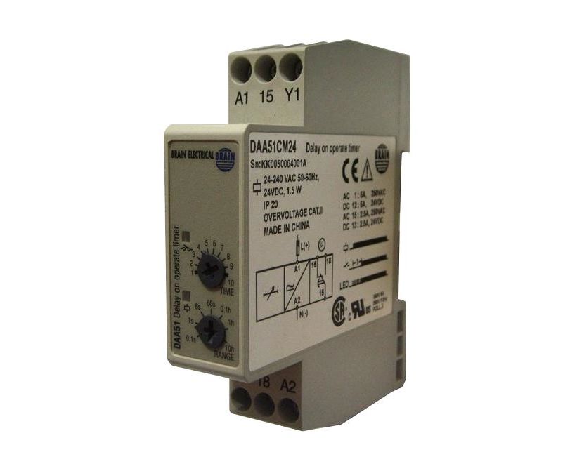 The DAA51CM24 is a multi-voltage delay on Operate Timer for mounting on DIN rail with 7 selectable time ranges within 0.1s and 100 hours. Housing 17.5mm wide for SPDT version is suitable both for back and front panel mounting.