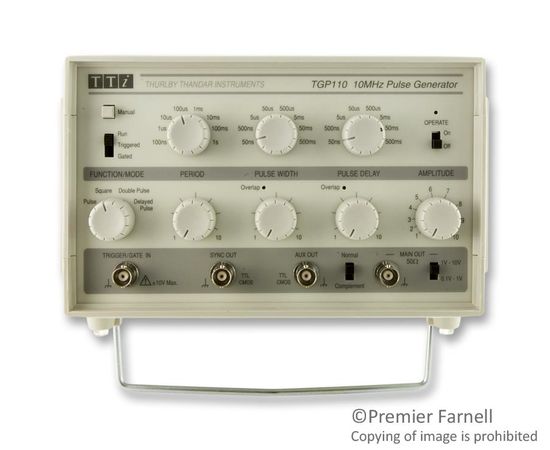 Генерирование импульсов для стимулирования и контроля электронных систем выходит за рамки возможностей даже самых сложных генераторов функций. Архитектура специализированного генератора импульсов позволяет ему генерировать импульсы заданной ширины, независимо от частоты повторения циклов, обеспечивая рабочий цикл, который может доходить до 1 на 100 миллионов. В дополнение к непрерывному режиму работы, могут генерироваться одиночные или множественные импульсы в соответствии с сигналами запуска или стробирования с точно определенным соотношением времени. Выделенный выходной усилитель импульсов сигнала обеспечивает плоские импульсы с быстрым временем нарастания и падения при изменяющейся амплитуде. TGP110 позволяет выбирать задержку между синхронным и импульсным выходами. В режиме запуска он так же устанавливает задержку между сигналом запуска и началом импульса.