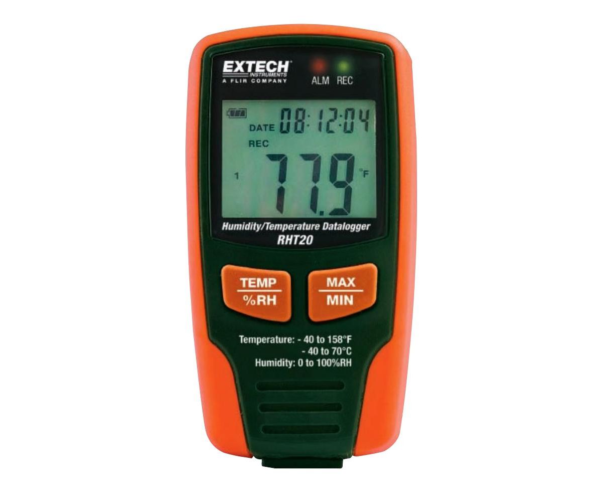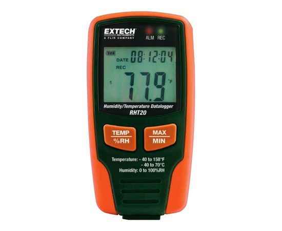 The RHT20 from Extech Instruments is a humidity and temperature datalogger. Featuring a temperature range of -40°C to 70°C with an accuracy of ±1°C/1.8°F and humidity measuring range from 0 to 100%RH with ±3%RH accuracy. It records up to 16,000 humidity and 16,000 temperature readings with a user programmable sample rate. Dew Point indication via the included Windows-compatible software. Selectable data sampling rates of 2s, 5s, 10s, 30s, 1m, 5m, 10m, 30m, 1hr, 2hr, 3hr, 6hr, 12hr and 24hr. User-programmable alarm thresholds for RH and temperature. LCD displays current temperature and humidity readings plus min/max and alarm status. Long battery life. Place or mount the datalogger in monitoring location. Datalogger records temperature and humidity at sample rate set by user. Connect the datalogger to PC via USB interface to retrieve readings. Datalogger displays the current humidity and temperature plus min/max and alarm status so it can viewed anytime during the recording process.